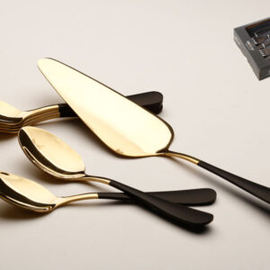 סט 6 מזלגות קינוח + כף עוגה נירוסטה זהב מבריק ידיות שחור