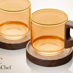 זוג כוסות קפה זכוכית אמבר פס זהב DreamChef עם תחתיות עץ