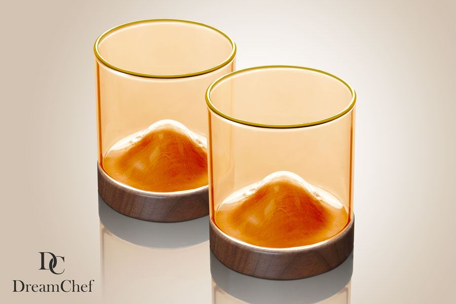 זוג כוסות זכוכית אמבר פס זהב לשתייה חמה DreamChef עם תחתית עץ