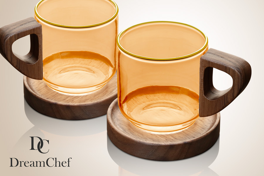 זוג ספלי קפה אמבר פס זהב DreamChef בשילוב עץ + תחתיות עץ