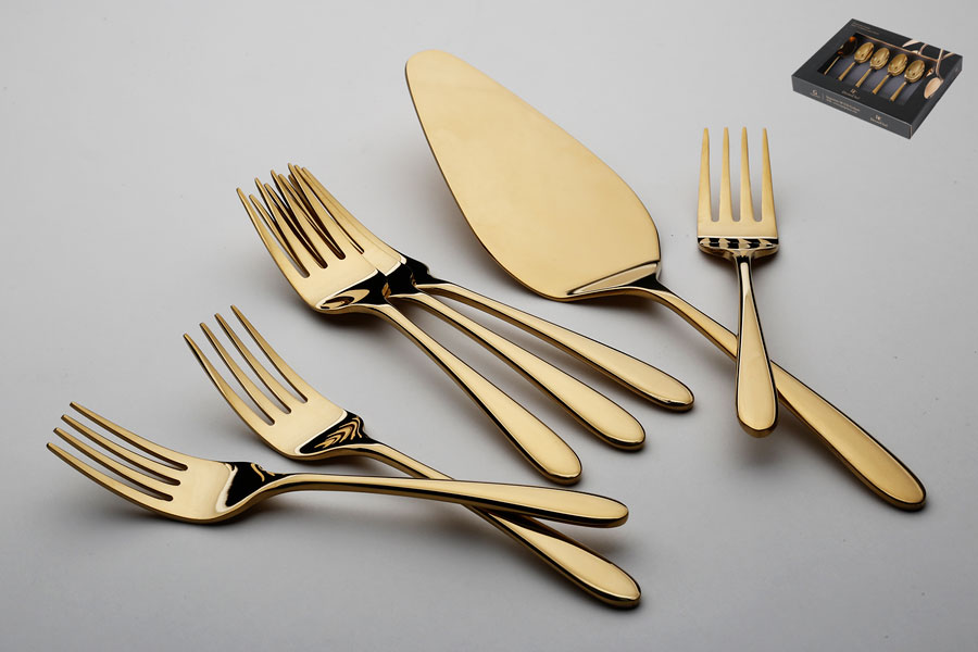 סט כף עוגה +6 מזלגות דגם Smooth נירוסטה 18/10 זהב מבריק