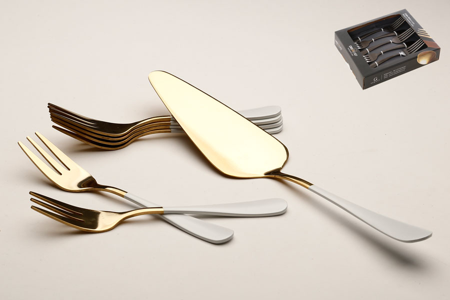 סט 6 מזלגות קינוח + כף עוגה נירוסטה זהב ידיות לבן מט